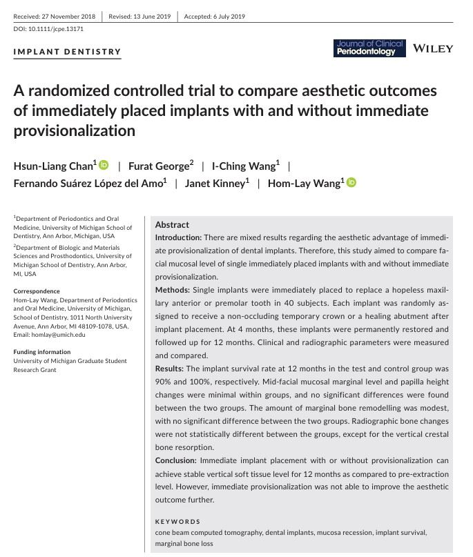 隨機對照試驗:比較立即植入植體搭配與不搭配即時暫時性修復之美學結果